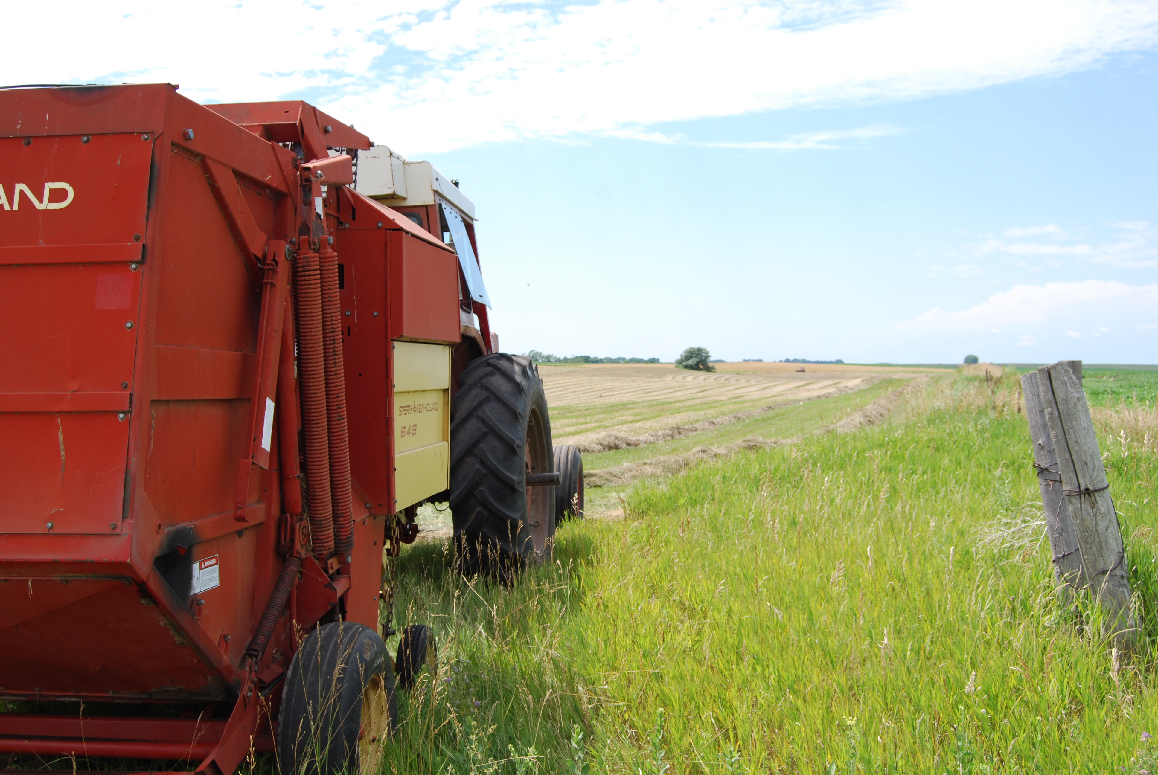 What model round baler? I had one of NH's first chain and slat balers. A 846, didn't make a very heavy bale and was a odd size but was very simple to run. Would roll anything up in front of it. Wet hay, dry hay, cornstalk, fenceposts, limbs, mother in laws, etc.